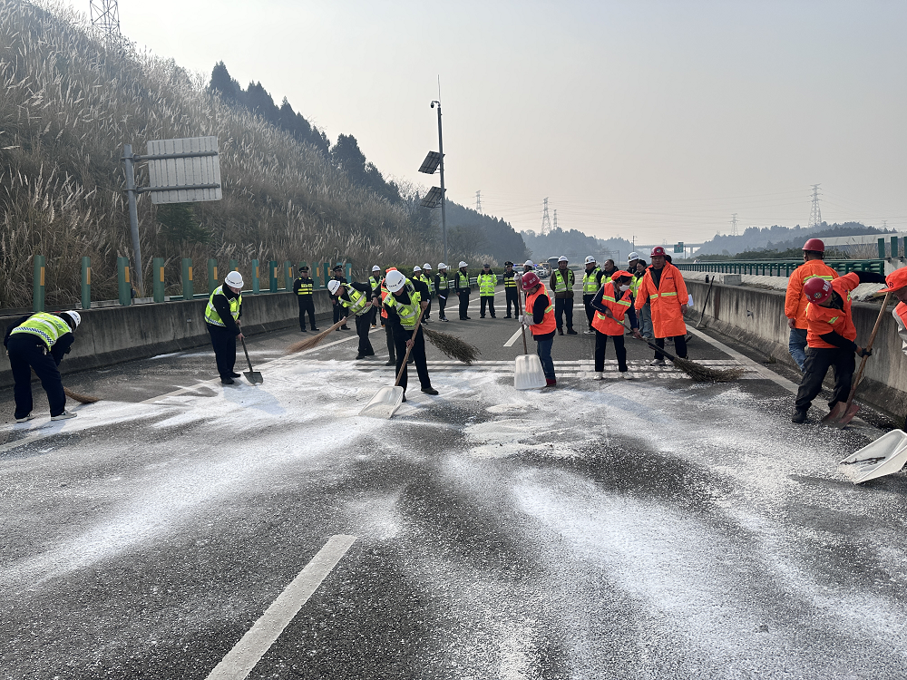 演練模擬12月17日突發(fā)強(qiáng)降雪,S1成萬(wàn)高速綿陽(yáng)繞城段涪江特大橋上行路段(K130+600M)橋面出現(xiàn)快速積雪凝冰、車(chē)輛無(wú)法正常行駛,1輛車(chē)輛因避讓不及發(fā)生碰撞的場(chǎng)景。事件發(fā)生后,高開(kāi)司、執(zhí)法十五大隊(duì)、高速交警六大隊(duì)、路橋養(yǎng)護(hù)、綠化、應(yīng)急救援等“一路三方”應(yīng)急指揮體系迅速啟動(dòng),高開(kāi)司第一時(shí)間調(diào)度融雪除冰車(chē)、救援車(chē)等應(yīng)急設(shè)備趕赴現(xiàn)場(chǎng),按照“先橋面、后路面,先彎道、后直道,先坡道、后平道”原則,快速開(kāi)展融雪除冰作業(yè),路橋養(yǎng)護(hù)、綠化及時(shí)清除路面積雪結(jié)冰隱患;應(yīng)急救援及時(shí)將碰撞車(chē)輛拖離現(xiàn)場(chǎng);高速交警全程指揮交通,路巡人員設(shè)置警示標(biāo)志、引導(dǎo)車(chē)輛減速慢行、實(shí)施分流管控,維護(hù)現(xiàn)場(chǎng)通行秩序,避免交通擁堵和事故發(fā)生;路政執(zhí)法人員加強(qiáng)現(xiàn)場(chǎng)巡查,排查道路設(shè)施安全隱患,同步做好信息傳遞工作,確保三方信息實(shí)時(shí)共享、指令高效傳達(dá)。